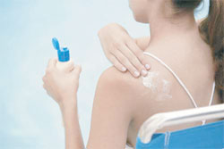 Sunscreens should be applied to dry skin 15 to 30 minutes before going outdoors. When using sunscreen, be sure to apply it to all exposed areas and pay particular attention to the face, ears, hands, and arms. Rub it in thoroughly, including the newer spray versions. Don’t let the spray sit on the skin’s surface. Children especially might rub it off accidentally or on purpose.