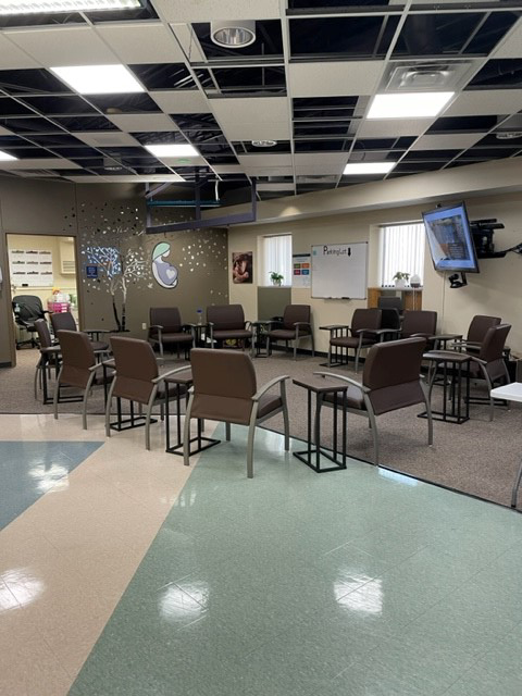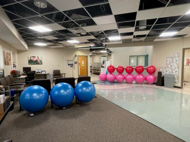 The group room is designed to be nurturing and comfortable with food and snacks, music, aromatherapy, yoga balls, birthing dolls, and yoga mats. Expectant moms learn stretches and muscle strengthening.