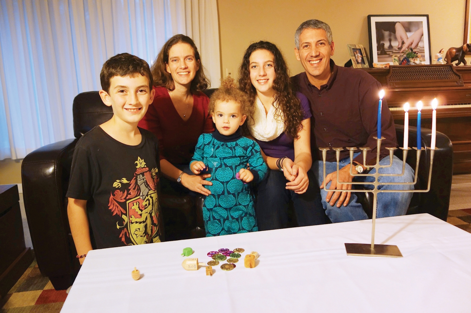 Hanukkah has a special meaning for the Musher-Eizenman family this year. They traveled to Israel this past summer, and visited the site where the Temple in Jerusalem used to stand. They will play with the dreidel they bought in Israel, with letters that stand for “A great miracle happened here,” and recall the two miracles marked by the holiday: the tiny Jewish army of the Maccabees that faced the Greek army, and the one-day supply of oil in the Temple menorah that lasted eight days. Foods cooked in oil, such as potato latkes and donuts, will be on the menu, and mom Dara notes she will have to add Thanksgiving foods to her table since the two holidays fall on the same day this year. The children Ella, 13, Jonah, 10, and Sylvia, 2, will receive chocolate coins called gelt.The family will light the candles on the menorah, exchange small gifts, and sing Hanukkah songs, all while basking in the joy of the Jewish holiday.