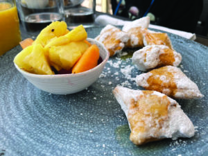 After viewing PK’s post, I told the kids about the French toast with Lucky Charms. While it wasn’t available the day we visited, there were plenty of other kid-friendly options. Camille chose the beignets with fruit, after I explained they were essentially small doughnuts covered in powdered sugar and honey. Her brother wanted to order the same, but I assured him his little sister would share. He took a risk and ordered his first-ever chicken and waffles, requesting the maple syrup on the side.