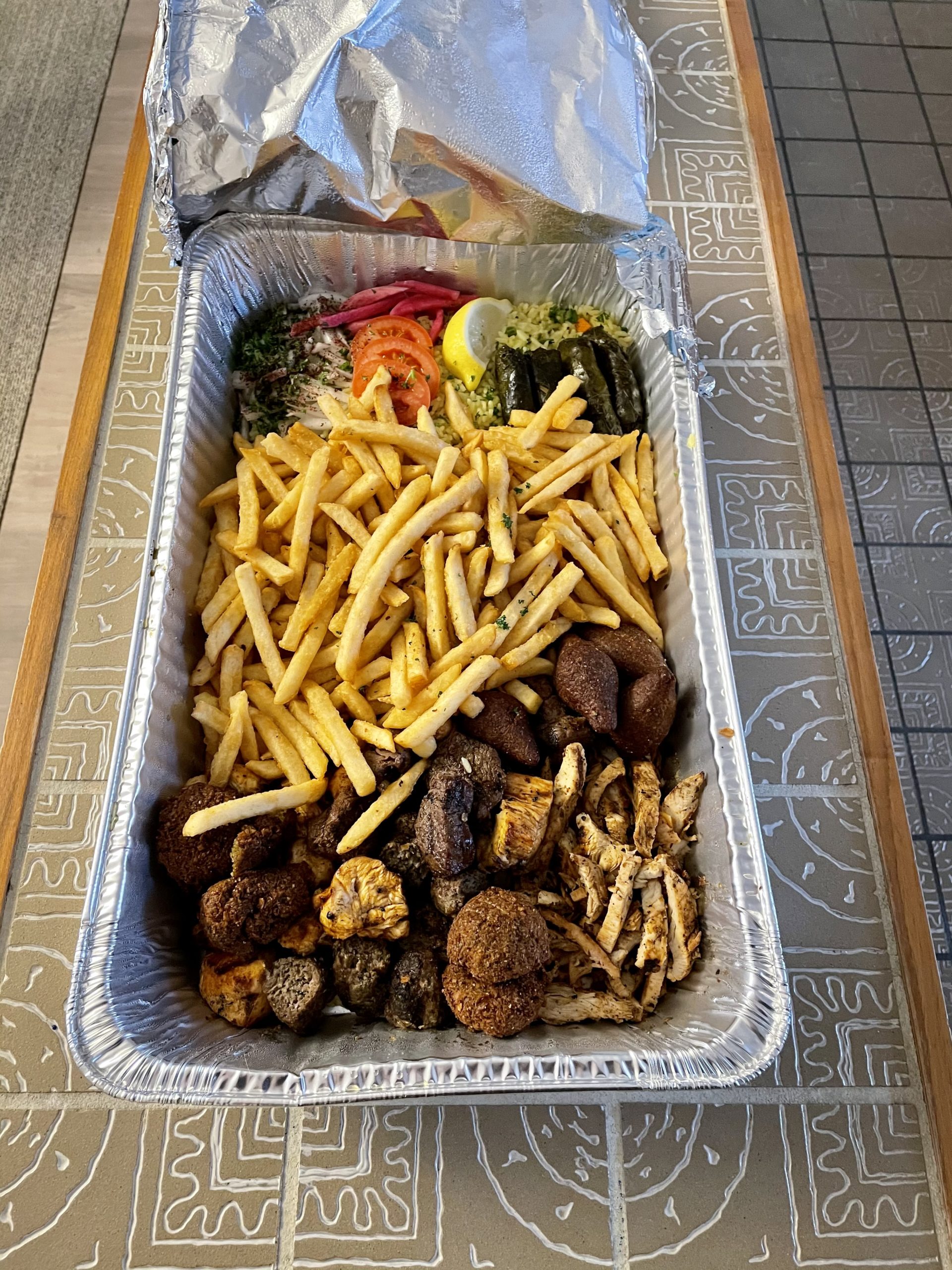 While the four kids were not overly enthusiastic about Mediterranean food, I popped some chicken nuggets in the oven for them, cut up some apples, and they enjoyed the fries and rice from Yala Kol. We ordered the platter for 4-5 people for $49.99, and it provided meals for four adults, sides for four kids, and plenty of leftovers for the following day.