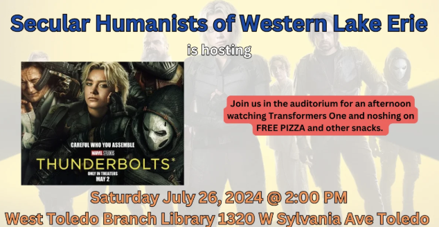 Since April 2024, the Secular Humanists of Western Lake Erie have shown a movie on the last Saturday of each month at the West Toledo Branch Library, 1320 W. Sylvania Ave. It’s open to youths from grade school through junior high and high school.