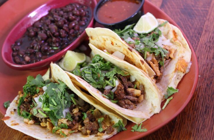 The smash burger tacos ($14) were a hit with both of my adolescent boys. Made with fresh seasoned ground beef, the three tacos were nestled in grilled flour tortillas, topped with cheese, lettuce and pickles and served with a side. My husband went with the Trash Tacos ($17), corn tortillas heaped with a mix of steak, grilled chicken and chorizo. He described them as meat lover’s tacos.