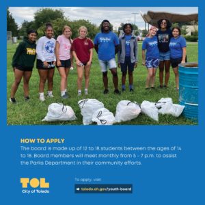Applicants for the Youth Advisory Board should be 14-18 years old and passionate about serving a two-year term to offer board members a young person’s perspective on decisions impacting the Toledo parks system. Youth Advisory Board members should have a strong work ethic, as well as an interest in learning and making a positive impact in the lives of Toledo youth.